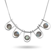 Epitome of simple elegance. This contemporary collar necklace is composed with five sterling silver U-shape frames and completed with 8mm orb shaped gemstones. The frames are highly polished and slide on the chain. The chain is adjustable from 16 inches to 18 inches. To view matching earrings, click here.
